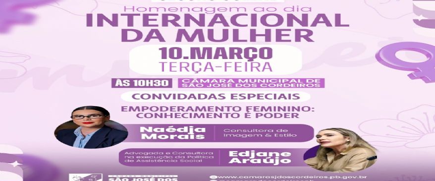 A Câmara Municipal de São José dos Cordeiros realizará, na próxima terça-feira, dia 10 de março, uma sessão solene em homenagem ao Dia Internacional da Mulher. O evento acontecerá a partir das 10h30, na sede do Poder Legislativo Cordeirense.